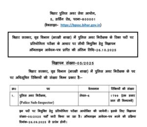 Bihar Police SI Recruitment 2025:- बिहार पुलिस अधीनस्थ सेवा आयोग (BPSSC) ने सब इंस्पेक्टर (SI) के 1799 पदों पर भर्ती के लिए आधिकारिक नोटिफिकेशन है. यह उन सभी अभ्यर्थियों के लिए एक सुनहरा अवसर है, जो बेसब्री से Bihar Police SI Recruitment 2025 न्यू भर्ती का इन्तेजार कर रहे थे. विज्ञापन संख्या 05/2025 के तहत निकाली गई बिहार पुलिस सुब इंस्पेक्टर भर्ती के लिए आवेदन की अंतिम तिथि 26 अक्टूबर 2025 है. यदि आप इस BPSSC SI Recruitment 2025 के लिए अप्लाई करना चाहते हैं, तो इस लेख को अंत तक जरुर पढ़ें.